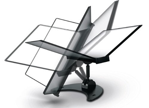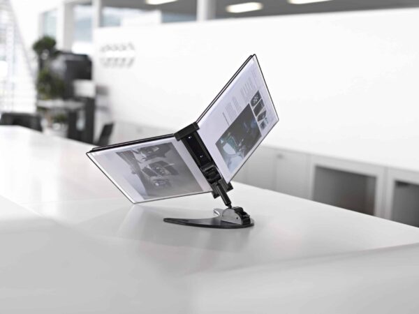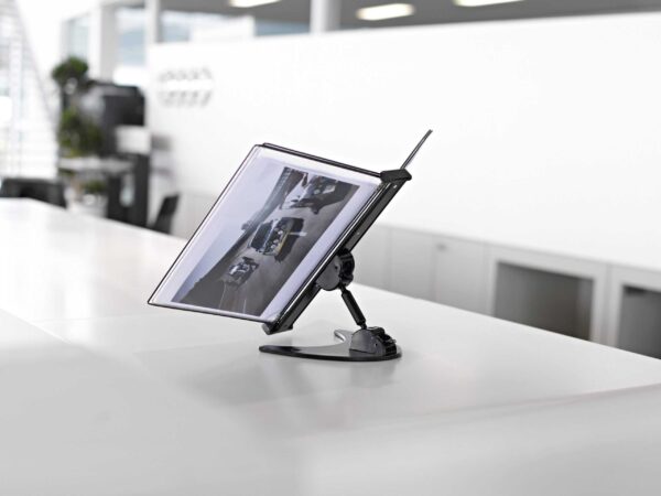Stoni nosač sa 10 crnih ramova A4 formata sa posebnim zglobovima, pomoću kojih se može menjati orijentacija ramova.